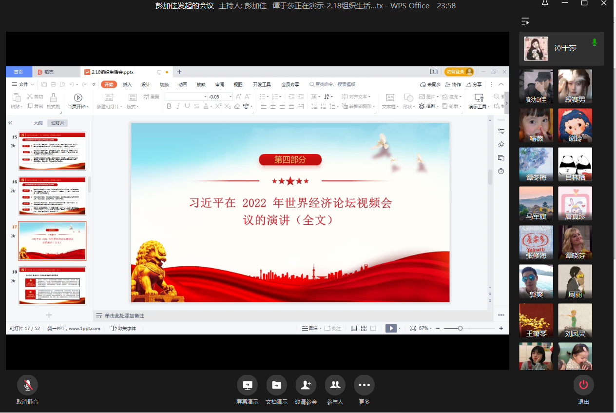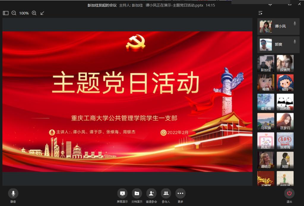 当前位置: 首页 >> 党建双创 >> 主题党日活动 >> 正文 伟德官网员工一支部2022年2月主题党日活动顺利召开 时间:2022年02月21日 09:32 来源:伟德官网 郭爽 2022年2月18日15时,伟德官网员工一支部在企业微信召开2月主题党日活动。员工一支部全体党员同志均准时参会。会议还邀请了教工一支部马军旗老师和部分发展对象及积极分子参加。 本次主题党日活动由谭小凤、谭于莎、周银杰、张修海同志领学2月组织生活会的相关文件。其中,谭小凤同志领学了《学习贯彻党的十九届六中全会精神专题研讨班开班式上的重要讲话精神》、《习近平在十九届中央纪委六次全会上的重要讲话精神》、《习近平:不断做强做优做大我国数字经济》;谭于莎同志领学了《习近平在2022年世界经济论坛视频会议的演讲(全文)》、《习近平在十九届中共中央政治局第三十六次集体学习会议上的讲话精神》、《习近平在中国同中亚五国建交30周年视频峰会上的讲话(全文)》;周银杰同志领学了《中国共产党第十九届中央纪律检查委员会第六次全体会议公报》、《1月24日中共中央政治局会议精神》、《2022年全国教育工作会议精神》;张修海同志领学了《全市党史学习教育总结会议精神》、《中国共产党重庆市第五届纪律检查委员会第六次全体会议决议》、《市委常委会传达学习贯彻习近平总书记在十九届中央纪委六次全会上的重要讲话精神》、《陈敏尔:坚定信心、凝聚共识、勇毅前行、为推动高质量发展贡献智慧力量》等内容。 领学结束后大家进行了激烈的讨论。其中,王箫琴同志说到:“当前我国处于高速发展的阶段,其中大数据,云技术越发重要,关注数字经济的发展,推动数字经济的发展尤为重要。”任瑶同志说到自己的看法:“今年是我国进入全面建设社会主义现代化国家,向第二个百年奋斗目标进军的重要一年,在这样特殊的一年里,作为青年老员工,增强“四个意识”、坚定“四个自信”、做到“两个维护”是对我们基本的要求。” 最后支部书记郭爽同志总结发言:“第一,对于党史的学习,不管是党员、预备党员、发展对象还是入党积极分子有应该每天保持学习,不断提高自己的理论储备,提高理论修养;第二,在即将开学之际,大家要按照公司的要求进行防疫,做好返校准备,不去中高风险地区,及时上报行程,做好核酸,及时返校。” 上一条:伟德官网员工一支部2021年度基层党组织组织生活会和民主评议顺利召开 下一条:伟德官网员工一支部2022年1月主题党日活动顺利召开 【关闭】
