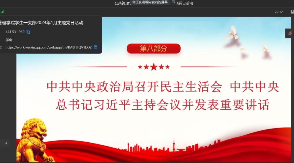 当前位置: 首页 >> 党建双创 >> 主题党日活动 >> 正文 伟德官网员工第一党支开展2023年1月份主题党日活动 时间:2023年01月13日 17:54 来源:伟德官网 郭爽 伟德官网员工第一党支开展2023年1月份主题党日活动 2023年1月13日,伟德官网员工第一党支部在企业微信以集中学习的方式开展了主题党日活动,本次活动应到27人,实到27人,本次活动由支部书记郭爽同志主持。 会议伊始,首先是由2019级龙钎君、向袁莉、邓明利、李心雨四位党员同志领学1月相关学习内容。其中,龙钎君同志领学了《中共中央政治局12月6日会议精神分析研究2023年经济工作研究部署党风廉政建设和反腐败工作》、《习近平在中共中央12月2日党外人士座谈会上的重要讲话精神》、《习近平总书记重要文章《继承和发扬党的优良革命传统和作风弘扬延安精神》(《求是》2022年第24期)、《习近平在《生物多样性公约》第十五次缔约方大会第二阶段高级别会议开幕式上的致辞》、《习近平在12月15日至16日中央经济工作会议上的重要讲话精神》的内容,向袁莉同志领学了《习近平总书记重要文章《谱写新时代中国宪法实践新篇章——纪念现行宪法公布施行40周年》》、《习近平在12月23日至24日中央农村工作会议上的重要讲话精神》、《习近平在中共中央政治局12月26日至27日民主生活会上的重要讲话精神》的内容,邓明利同志领学了《习近平在全国政协新年茶话会上的讲话》、《国家主席习近平发表二〇二三年新年贺词》、《习近平总书记重要文章《为实现党的二十大确定的目标任务而团结奋斗》》、《市委常委会12月9日会议精神学习贯彻习近平总书记重要讲话精神坚决维护党中央集中统一领导》的内容,李心雨同志领学了《市委六届二次全会会议精神 全面学习宣传贯彻党的二十大精神在新时代新征程为建设社会主义现代化新重庆而团结奋斗》、《市委常委会12月23日会议精神传达学习习近平总书记重要指示精神把全面实施宪法工作提高到新水平》、《市委理论学习中心组(扩大)1月3日深入学习贯彻党的二十大精神专题学习会议精神》的内容。 随后由陶友明同志分享了焦裕禄的藤椅的故事。焦裕禄以“生也沙丘,死也沙丘,父老生死系”的赤诚,以“心中装着全体人民、唯独没有他自己”的公仆情怀,诠释着亲民爱民、艰苦奋斗、科学求实、迎难而上、无私奉献的焦裕禄精神。焦裕禄去世了,但焦裕禄精神仍在延续。 所有领学完毕后,与会同志展开讨论。郑佳锐同志说,要落实产业帮扶政策,推动乡村产业全链条升级,增强市场竞争力和可持续发展能力。巩固拓展脱贫攻坚成果是全面推进乡村振兴的底线任务,要继续压紧压实责任,把脱贫人口和脱贫地区的帮扶政策衔接好、措施落到位,坚决防止出现整村整乡返贫现象。伍燕玲同志说同志要带头强化系统观念,提高政治站位,学习落实好党的方针政策。 最后,郭爽同志对自身一年来支部书记工作作了小结,对支部工作提出新要求,他提出在今后将会组织策划更多的支部活动,加强宣传与引导,吸引更多优秀的人才加入党支部,壮大支部人才队伍。在总结讲话中,他谈到新时代新征程我们应该树立新的目标,做德智体美劳全面发展的人,建设优秀的员工党支部,为公司公司发展做贡献。 上一条:伟德官网员工第一党支部召开2023年2月主题党日活动 下一条:伟德官网员工第一党支部召开2022年12月主题党日活动 【关闭】