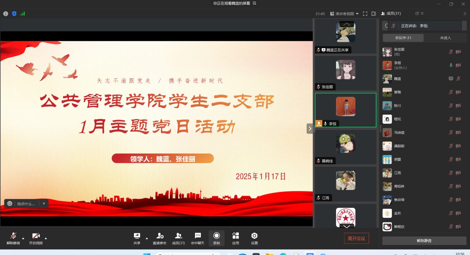 当前位置: 首页 >> 党建双创 >> 主题党日活动 >> 正文 伟德官网员工第二党支部召开2025年1月主题党日活动 时间:2025年01月17日 18:42 来源:伟德官网 李恒 2025年1月17日,伟德官网员工二支部在线上开展了1月主题党日活动。本次活动由支部书记李恒同志主持。 会上,张佳丽、魏蓝两位同志领学了《中央经济工作会议精神》、《习近平总书记对做好“三农”工作作出的重要指示精神》、《习近平总书记在庆祝澳门回归祖国25周年大会暨澳门特别行政区第六届政府就职典礼上的讲话》、《国家主席习近平二〇二五年新年贺词》等内容。与会党员同志结合自身体会,分享学习心得。 最后,李恒同志传达上级党委工作要求。她鼓励全体党员在新的一年凝心聚力、增强信心,迎难而上、奋发有为,以更加饱满的热情和昂扬的斗志做好支部的建设工作。同时再次强调员工党员日常管理的重要性,要求党员同志以身作则,在学习、生活中起到先锋模范作用。 上一条:伟德官网员工第一党支部召开2025年2月主题党日活动 下一条:伟德官网员工第一党支部召开2025年1月主题党日活动 【关闭】