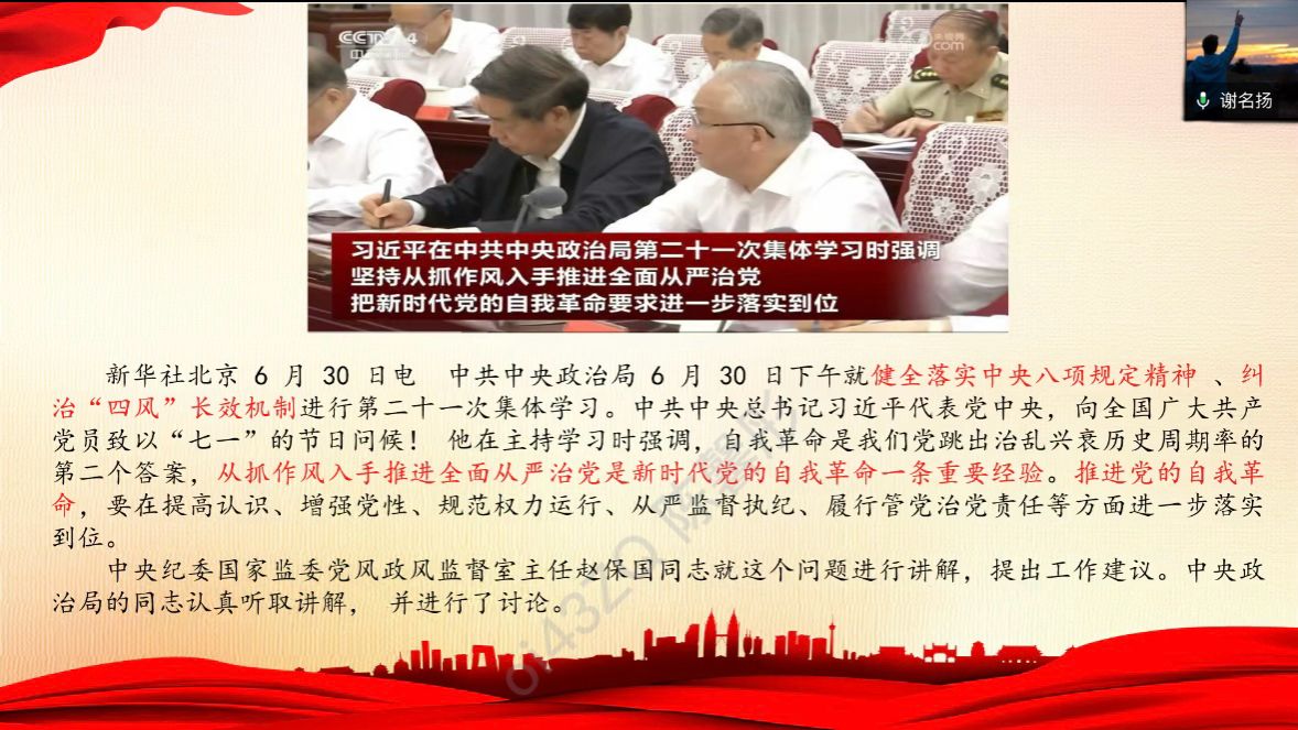 当前位置: 首页 >> 党建双创 >> 主题党日活动 >> 正文 伟德官网员工第一党支部7月主题党日活动 时间:2025年07月08日 10:58 来源:伟德官网 杨阳 2025年7月7日,伟德官网员工第一党支部通过企业微信平台召开7月主题党日活动。会议由员工党员黄政龙同志主持,支部全体党员线上参会。 会上,谢书楠同志介绍了新加入支部的党员教师杨阳、梅艺同志,并说明两位教师今后将承担员工党支部的指导与管理工作。她表示,希望全体党员加强协作、密切联系,在组织生活中发挥好师生协同作用,持续推动支部建设迈上新台阶。 随后,朱羿明、谢名扬同志分别领学了《团结奋斗是中国人民创造历史伟业的必由之路》(《求是》杂志刊发)和习近平总书记在中共中央政治局第二十一次集体学习时的重要讲话精神,引导党员深刻理解“团结奋斗”的时代价值与现实意义。王若瑜同志分享了黄君珏烈士的英勇事迹,展现了革命先烈的坚定信仰与牺牲精神。刘念同志结合全国劳模冯秋荣的先进事迹,强调要将责任担当融入实际行动。陈馨彤同志围绕中央八项规定,倡导员工党员弘扬优良作风,抵制形式主义与享乐主义。 最后,谢书楠同志在总结中表示,假期既是身心调整的重要阶段,更是加强理论学习、锤炼党性的关键时期。她鼓励全体党员持续学习、主动作为,强化与共学社区、党员服务站的协同联动,推动党建与实践深度融合、服务实效持续提升,为增强支部凝聚力与组织力打下坚实基础。 上一条:伟德官网员工第二党支部召开2025年7月主题党日活动 下一条:公管公司陆嘉书记主讲专题党课——党在新时代的“徙木立信”之举 【关闭】