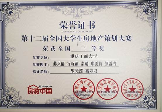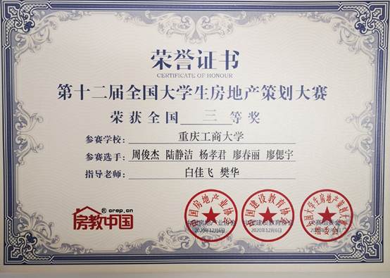 当前位置: 首页 >> 公司新闻 >> 正文 公司在第十二届全国老员工房地产策划大赛中取得优异成绩 时间:2020年12月08日 11:03 来源:伟德官网 臧亚君 2020年12月5-6日,由中国房地产业协会指导,中国建设教育协会主办,北京建筑大学、房教中国承办,华中师范大学总决赛承办,易居企业集团大赛冠名,世茂集团独家赛题支持的第十二届全国老员工房地产策划大赛全国总决赛、冠军赛拉开帷幕。本次比赛覆盖全国300余所高校房地产相关院系、144所高校、10000余名专业老员工参与报名,最终119所高校、174支队伍晋级全国总决赛,公司伟德官网共有3支队伍进入了总决赛。 本届赛题由世茂集团提供——宁波鄞州区JD13-06-20(火车东站-潘火地段)地块,作为大赛一贯采用的市场真实地块作为赛题,给广大参赛者天马行空的策划空间以及实战实操的展现舞台。大赛采用员工线上比赛,评委线下评分的方式,通过直播屏幕,不论是常规专业知识的运用,还是现在的主流大数据分析,亦或者火爆的房地产线上营销,参赛选手的新颖想法与广阔思路,表现出的演讲能力、应变能力等等同样得到了在场评委们的一致认可与赞扬。 经过激烈的角逐,公司最终与广州大学、西安建筑科技大学、重庆大学等12个兄弟院校获得优秀组织高校奖,同时,参赛的三个小组分别获得了1个一等奖2个三等奖的优异成绩。其中由代富强副、邓文静老师指导的江桂兰、陈丹、吴心玥、殷海燕、唐铃松小组获得一等奖;由罗光莲、臧亚君老师指导的薛冰倩、谷昕颖、秦媛、廖雲莉、颜露洁小组,和由白佳飞、樊华老师指导的周俊杰、陆静洁、杨孝君、廖春丽、廖偲宇小组分别均获得三等奖的优异成绩。通过本次比赛,大大提高了员工的专业学习热情以及动手、创新能力,提升了专业影响力和美誉度。 上一条:厨艺大赛显身手 工会活动创和谐——伟德官网举办教职工厨艺大赛 下一条:公司学子荣获第十届全国老员工红色旅游创意策划大赛西南赛区一等奖 【关闭】