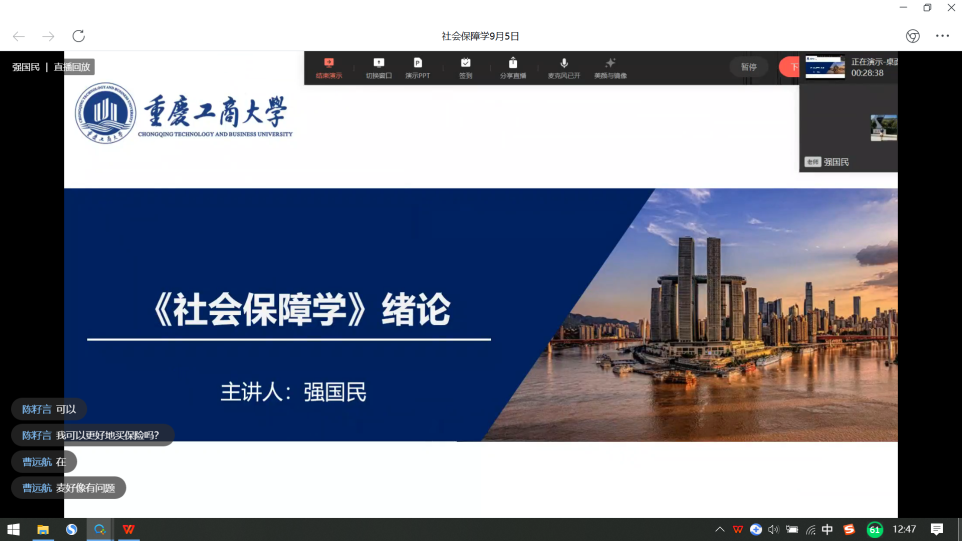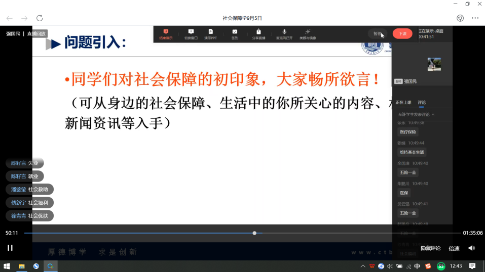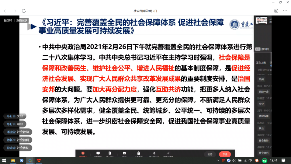 当前位置: 首页 >> 教学动态 >> 正文 《社会保障学》课程线上教学实施情况 时间:2022年09月19日 15:38 来源:伟德官网 强国民 9月5日上午3-4节,伟德官网劳动与社会保障系新进教师强国民通过精心准备,利用企业微信首次线上直播为20财政一、二班93名员工讲授《社会保障学》课程。在直播教学中,强国民老师积极融入课程思政,从同学们对社会保障初印象介入,引导同学们积极参与课堂互动,踊跃发言,关注现实中的社会保障问题,最后落脚到习近平同志对社会保障制度的定位——社会保障是治国安邦的大问题,如此通过理论与实践相结合的方式不断启发同学们去关心、思考并尝试去解决现实中的社会保障问题,在提升教学效果的同时也进一步提升了员工的专业能力和综合素质。 上一条: 高标准 高质量 严要求 下一条:【党建"双创"】以赛促学,扎实推进学科课程思政建设——伟德官网学子在“第十二届全国老员工红色旅游创意策划大赛”中斩获佳绩 【关闭】