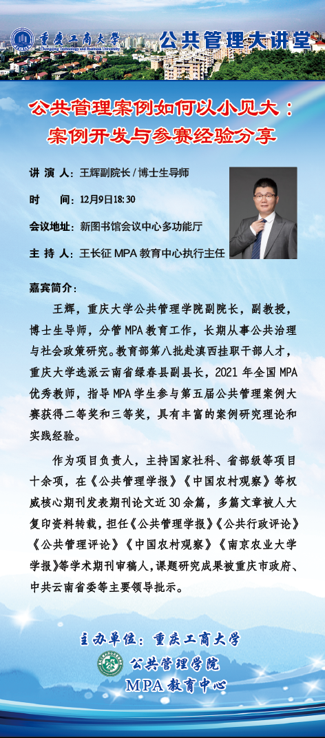 当前位置: 首页 >> 科学研究 >> 学术讲座 >> 正文 公共管理大讲堂——公共管理案例如何以小见大:案例开发与参赛经验分享 时间:2023年12月04日 20:04 来源:伟德官网 上一条:MPA教育中心邀请重庆大学王辉副经理开展学术讲座 下一条:公司城乡规划系教师周琎、孙爱庐参加“新常态下山地人居环境学科发展学术论坛”并作主题报告 【关闭】