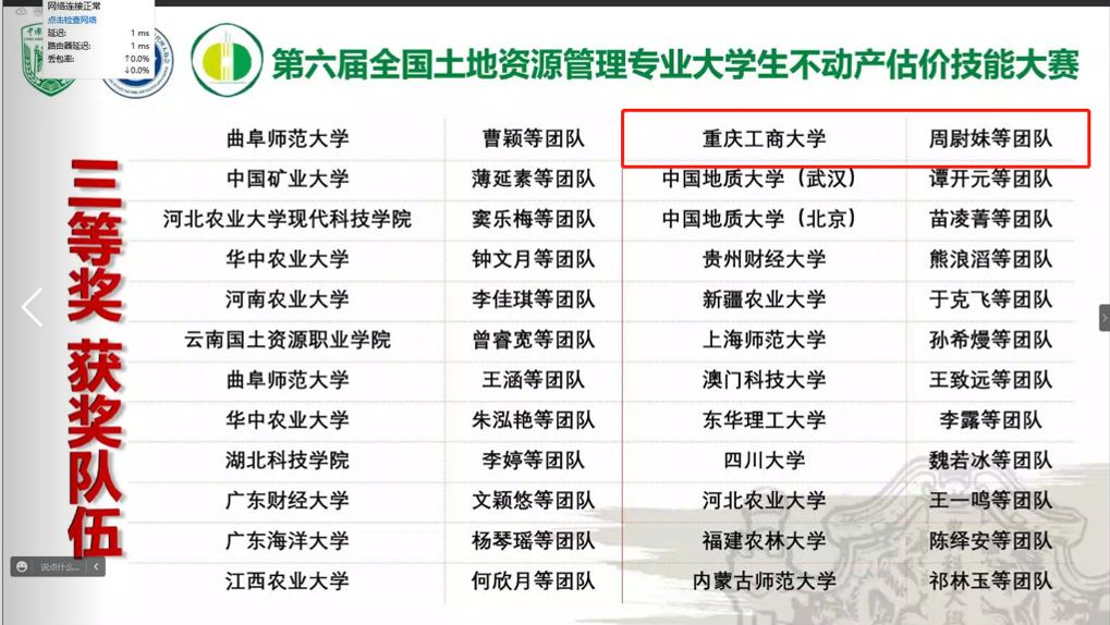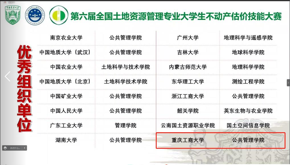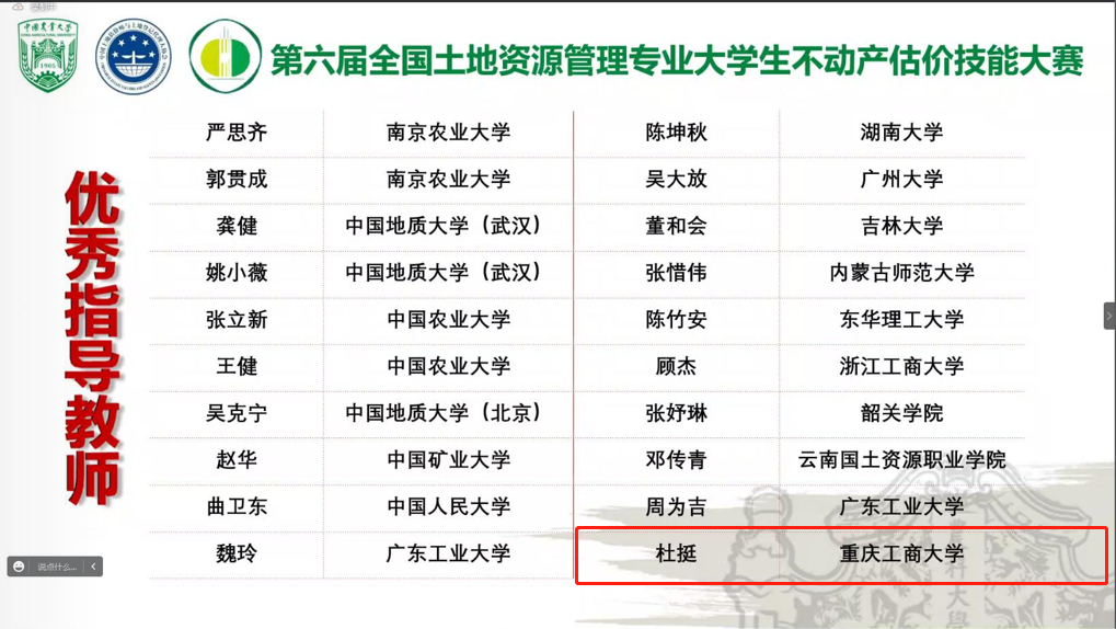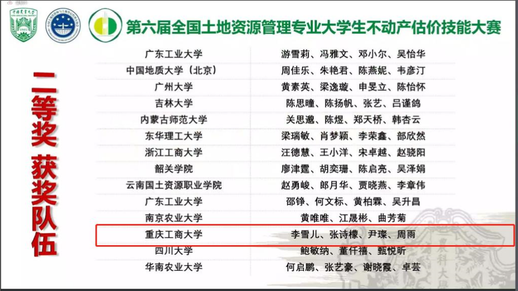 当前位置: 首页 >> 联系我们 >> “龙脊杯”学科竞赛节 >> 正文 喜报!公司学子在第六届全国老员工不动产估价技能大赛中斩获佳绩 时间:2022年09月19日 16:12 来源:伟德官网 杜挺 2022年9月18日,第六届全国老员工不动产估价技能大赛决赛在中国农业大学举行。公司土地资源管理系派出的两支参赛队伍在本次大赛中斩获多个奖项。由肖轶老师指导,本科生周尉妹、唐新颖、王仕菲、王子贤组队参赛作品《重庆市南岸区风临口袋公园土地开发权价值评估》荣获大赛“三等奖”。由杜挺老师指导,本科生李雪儿、张诗檬、尹璨、周雨组队参赛作品《重庆市巴南区鱼洞街道百胜村11组17号农村集体仓储用地开发权价值评估》荣获大赛“二等奖”。杜挺老师荣获大赛“优秀指导教师”。在全院师生共同努力下,公司荣获大赛“优秀组织单位”。 全国老员工不动产估价技能大赛由教育部高等公司公共管理类专业教学指导委员会、全国高校土地资源管理经理(系主任)联席会主办,是全国高校土地资源管理专业的品牌赛事之一。本次大赛以“探索与创新:面向未来的不动产估价”为主题,旨在培养和提升老员工的估价实践技能与实践创新能力。今年公司派出的两支队伍,经作品初筛、专家外审、线上评审、汇报答辩等环境,最终从全国65所高校的110支参赛队伍中脱颖而出。 此次比赛的筹备工作得到了公司领导的关注与支持,参赛同学和指导老师们努力推进项目研究进展,深入乡镇、街道开展实地调研,反复打磨和完善项目材料,组织了多轮答辩演练。最终,参赛项目在决赛中斩获佳绩! 据悉,经大赛组委会批准,明年将由公司承办第七届全国老员工不动产估价技能大赛。在今年大赛闭幕式上,李孜经理受邀代表明年承办方进行发言。 上一条:第五届伟德官网老员工乡村振兴规划策划大赛决赛顺利举行 下一条:关于举办第五届伟德官网老员工房地产策划大赛暨第十四届全国老员工房地产策划大赛校内选拔赛的通知 【关闭】