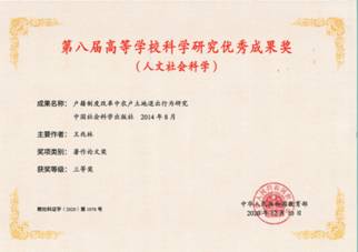 当前位置: 首页 >> 员工动态 >> 正文 公司成果喜获第八届全国高等公司科研优秀成果(人文社会科学)奖励 时间:2021年11月24日 12:28 来源:伟德官网 日前,教育部正式公布了第八届“高等公司科学研究优秀成果奖(人文社会科学)”的获奖名单。公司王兆林教授专著成果《户籍制度改革中农户土地退出行为研究》喜获“三等奖”。这是公司首次获得该奖项,标志着公司教师科学研究上的一次重要突破! 该成果由王兆林老师独立完成。该成果是基于农户视角系统全面研究系统“户籍制度”与“土地制度”改革联动问题的早期著作之一,并非是对该类研究的细枝末梢的修补,而是研究创新。该著作涉及的承包地退出、宅基地退出研究,更是当前承包地“三权”(所有、承包、经营)分置和宅基地“三权”(所有、资格、使用)的前期重要探索。 高等公司科学研究优秀成果奖(人文社会科学),是“高等公司哲学社会科学繁荣计划”的重要内容,是教育部为表彰和奖励全国高校哲学社会科学工作取得的成绩,激励广大科研工作者严谨治学、勇于创新、锻造精品,推动高校哲学社会科学繁荣发展的一项重大举措。该奖自1995年首设以来,一直是我国人文社会科学领域最具公信力和影响力的奖项,一般认为系国家级社科研究奖励。 上一条:公共管理大讲堂——人口统计与第七次全国普查数据分析应用 下一条:国家发改革市场与价格研究所所长、高级研究员杨宜勇在线为公司师生做题为“共同富裕与社会保障”的学术讲座 【关闭】