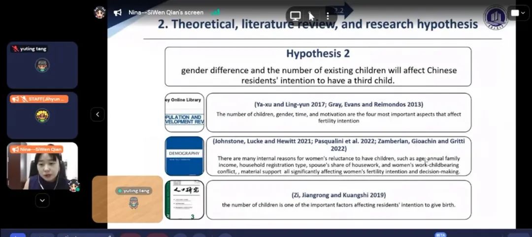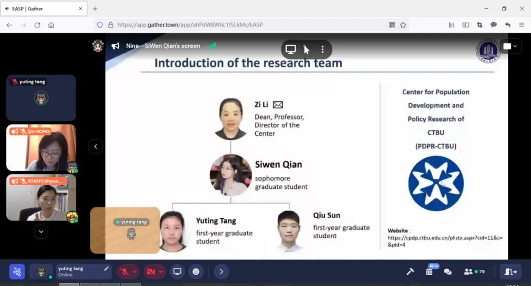 当前位置: 首页 >> 员工动态 >> 正文 公司李孜教授团队以文赴会参加第18届EASP年度会议 时间:2022年08月28日 18:48 来源:伟德官网 钱思汶 2022年6月24日,第十八届东亚社会政策年度会议(18th East Asian Social Policy conference)于Gather Town平台线上举行。中心主任李孜教授与硕士生钱思汶等的论文《The Influence of COVID-19 on intention of third-child in China》受邀做大会主题发言。 东亚社会政策(EASP)研究网络是东亚及其他地区的学者、研究人员、员工和社会政策从业者的区域协会。EASP成立于2005年1月,旨在促进社会政策分析师之间的研究交流与合作,并为东亚社会政策作为一门学科的发展提供论坛和交流平台。本次ESAP会议由东亚社会政策研究中心、韩国卫生与社会事务研究所以及韩国延世大学共同主办。第18届ESAP会议主题为:TRANSFORMATION OF POST-COVID WELFARE STATES IN EAST ASIA: BEYOND PRODUCTIVIST WELFARE CAPITALISM?(东亚后疫情时代福利国家的转型:超越生产力的福利资本主义?)探讨新冠疫情下严格的社会疏离是否加剧了社会孤独感和孤立感、东亚国家真正改变了多少?是否有任何显着和显着的社会政策变化?以及疫情背景下社会政策在不同的社会产生不同的结果。 会上,平台主任李孜教授团队受邀分享了论文《The Influence of COVID-19 on intention of third-child in China》论文。基于中心所做的《数字化时代婚育行为调查》回收数据展开实证分析,探讨了在生育意愿持续低迷的严峻背景下,新型冠状病毒肺炎对我国居民三孩生育意愿的影响因素研究。研究发现性别和现有孩次数会显著影响居民三孩生育意愿,且新冠疫情对我国居民的三孩生育意愿具有显著抑制影响。并在此基础上提出几点展望,以求为后疫情时代相关研究提供参考。 上一条:公司青年教师方浩参加2022年第二届信息管理国际会议(WSIM 2022)并作主题报告 下一条:公司青年教师孙爱庐参加成渝双城经济圈建筑与土木大类高校青年教师学术论坛并作主题报告 【关闭】